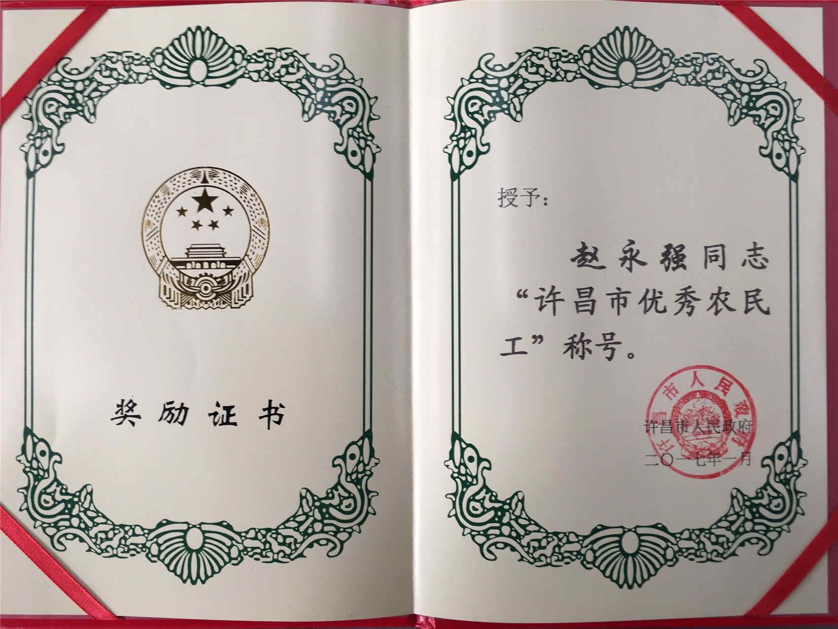 我公司員工趙永強同志喜獲“許昌市優秀農民工”稱號